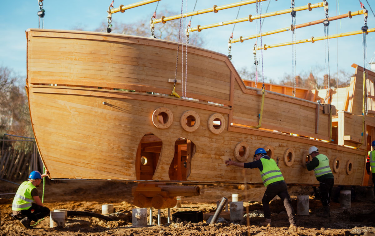The wooden ship was manufactured in Frasdorf, Germany and is predominately made from mountain larch wood that has been drawn from sustainably managed forests in the Bavarian Alps, where the harsh alpine conditions result in extremely slow growth. This means the timber is stronger, naturally rot resistant and there is no need for chemical treatments.